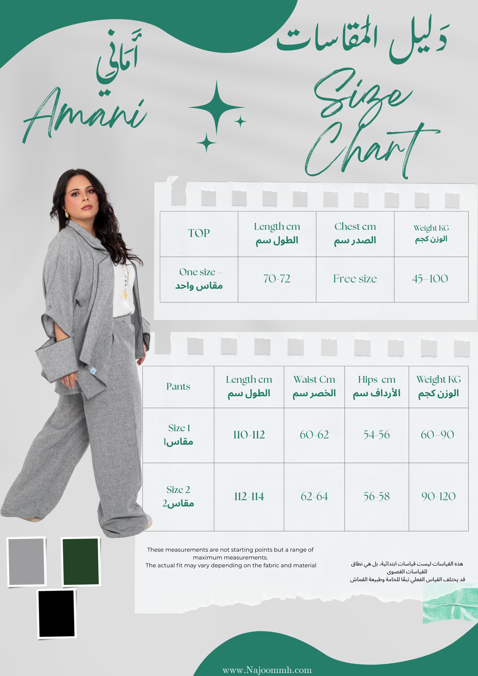 مَقَاسَانِ لِلسِّرْوَالِ يُنَاسِبَانِ 45–90 كِيلُوجْرَام، وَالقِمَاشُ الأُنْسَابُ لِلأَعْلَى يُلَائِمُ 45–120كِيلُوجْرَام